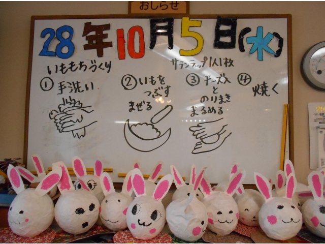 - 9月に皆さんと一緒に作成した張り子うさぎが見守る中、おやつつくりスタートです