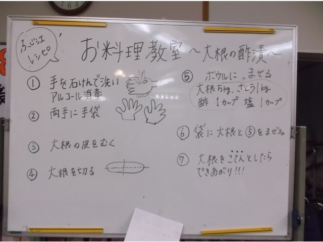 利用者様から「うちの畑でたくさん大根がとれたよ!」と今年も笑顔で教えてくださり、余っても仕方ないのでとデイサービスに持ってきてくださいました。そして、その大根をおいしくみんなでいただこうと、地元に伝わるおいしい大根の酢漬けの作り方を教えていただきました。今回は料理教室方式で教わりながらみんなで作りましたが、料理中もとてもにぎやかで皆さんも「料理をするのは久しぶり」、「昔は樽二つつけたよ」などお話しも止まらない楽しい料理教室になりました。