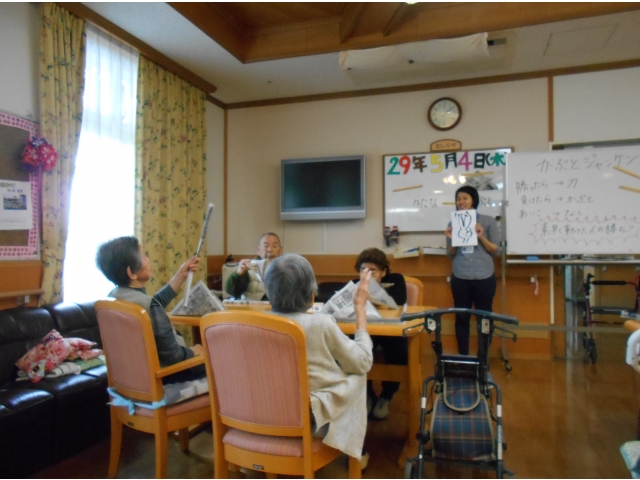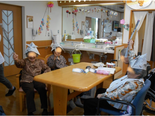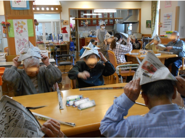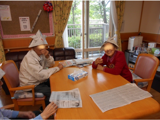 利用者の皆さんと一緒に「子どもの日」を思い出すレクリエーションも行いました。昔を思い出しながら新聞紙でかぶとと刀を折りました。昔はあんなに折ったのに忘れちゃったな、と話す方や途中まで折るとすぐに折り方を思い出す方とそれぞれのかぶとができました。かぶとをかぶるとみなさんの顔も童心に戻ったようでした。