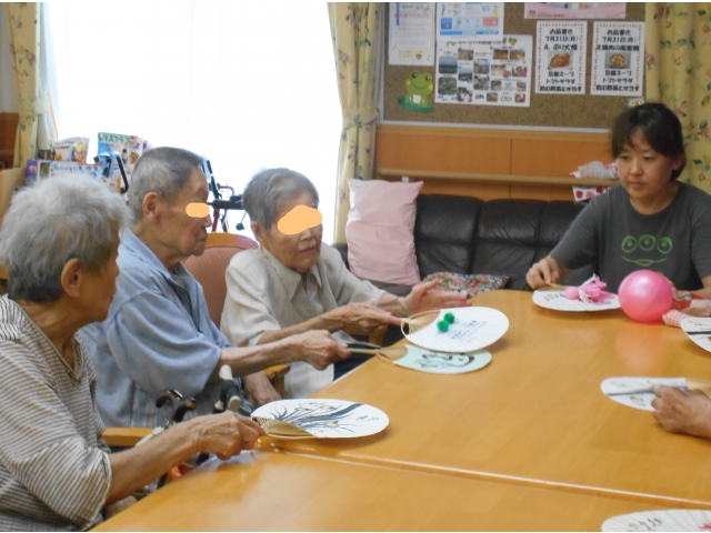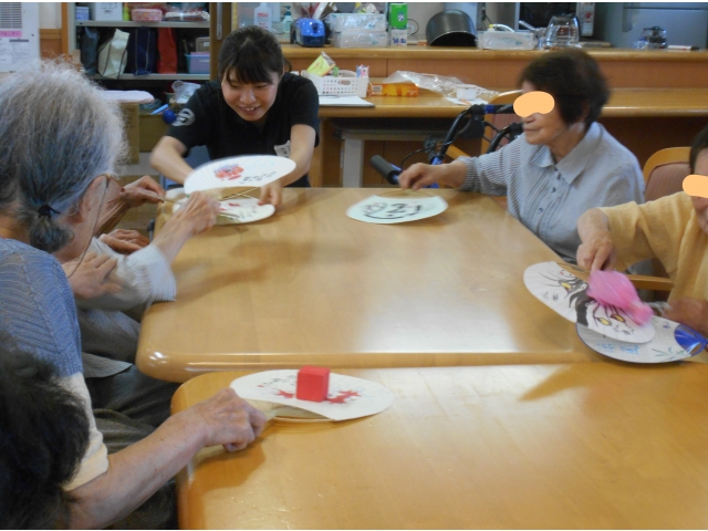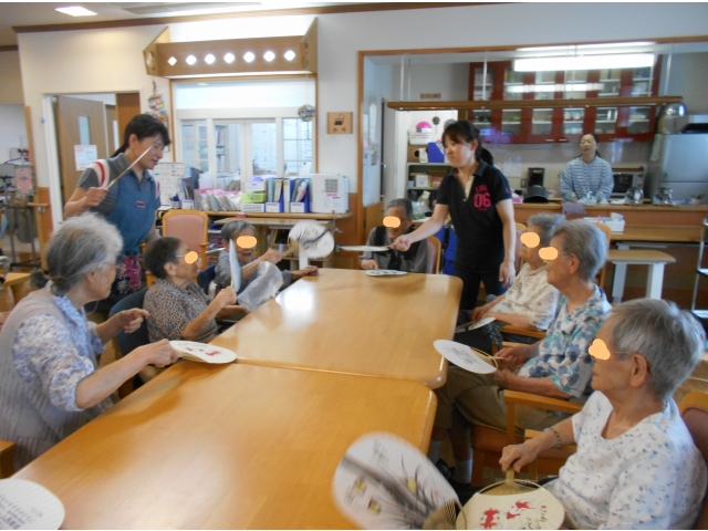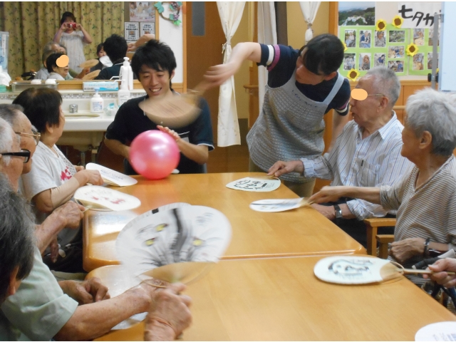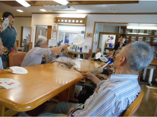 今月のレクリエーションは『うちわを使ったレクリエーション』です。道具はうちわ、あとは色々。暑い夏を乗り切るために昔の人が考えた文明の利器。ただ、今回は暑くなったら扇ぐという使い方だけではありません。ひとりひとつ、うちわを使って隣の人に色んなものを送ってまわすというゲームです。