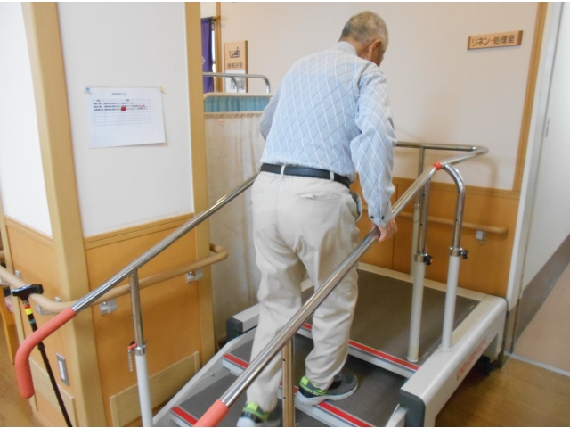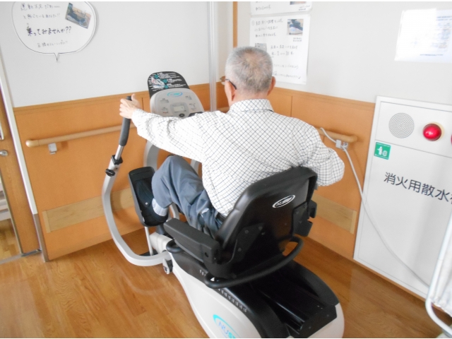 機能訓練内容はフットマシーンを使用した下肢筋力の向上、階段昇降機を使用した階段昇降、平行棒を使用した歩行訓練、下肢筋力向上のための集団体操などです。