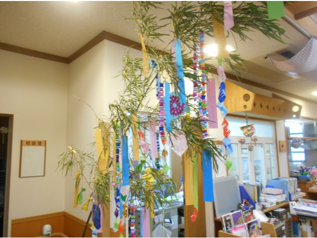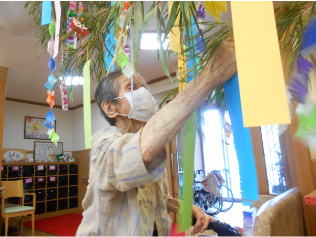 毎年7月になるとデイサービスでは、笹に手作りの七夕飾りをつけます。今年は短冊と貝殻飾りと切り抜き柄の飾りです。 職員が「短冊にお願い事を書いてみましょう。」とご利用者に伝えると、皆様は「何をお願いしようか。」「やっぱり健康一番かな。」「コロナの収束かなぁ。」など色々なお願い事を考えていました。そして皆様が書いたお願い事の第1位は、『○○が食べたい!』『○○が食べられますように』など食欲に関するものでした。皆様の元気な生命力に触れられた七夕になりました。