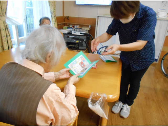 会が始まるとお一人お一人に職員が写真をお渡ししました。利用者様はご自分の笑顔を見ることがなかなかないので、嬉しいやら恥ずかしいやらといった表情で写真を眺めていました。そして、『長寿の心得』を読み、「へえ、なるほど。百歳まではがんばらないかんね。」などとお話しされていました。