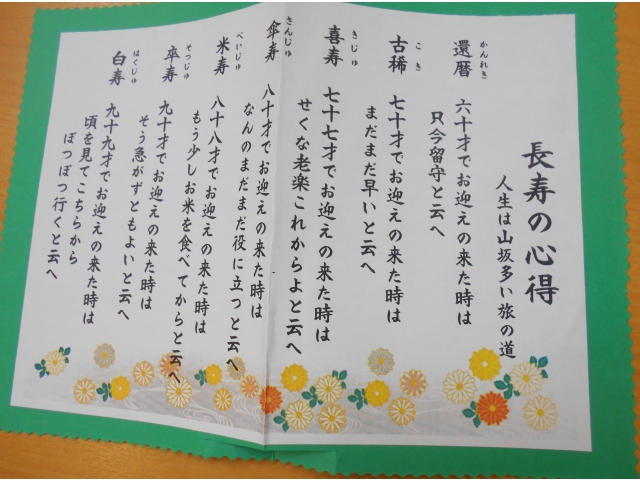 デイサービスの9月の行事といえば、『敬老会』です。字のごとく「老いを敬う会」です。利用者様にとっては大切な行事の一つです。今年の敬老会は時間短縮営業の為、利用者様の素敵な笑顔写真をプレゼントして、写真の裏に載っている『長寿の心得』を読んでおしゃべりを楽しもうということになりました。