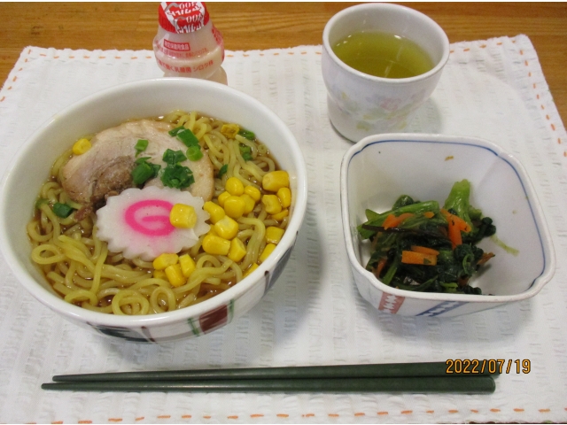 醤油ラーメン・小松菜と塩昆布のナムル風・ヤクルト