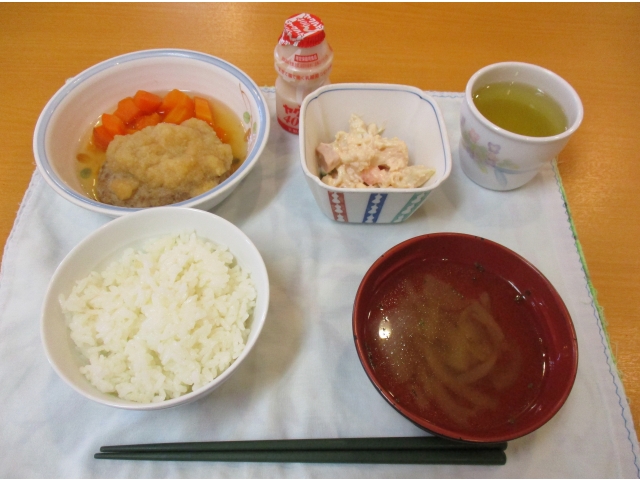 本日の昼食の献立です。 ・おろし煮ハンバーグ・コンソメスープ・オーロラソースサラダ・ヤクルト エネルギー412kcal・たんぱく質11.6g・脂質9.9g・炭水化物68.4g・食塩2.6g
