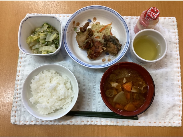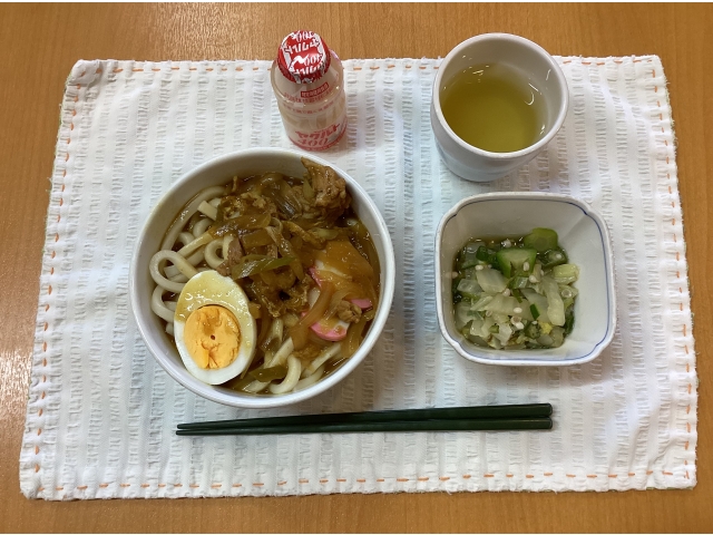 Aメニュー ・鶏の海苔唐揚げ・白菜とオクラの和え物・豚汁・ごはん・ヤクルト エネルギー551kcal、たんぱく質25.9g、脂質18.8g、炭水化物73.5g、食塩2.5g Bメニュー ・カレーうどん・白菜とオクラの和え物・ヤクルト エネルギー454kcal、たんぱく質17.5g、脂質14.5g、炭水化物68.5g、食塩2.3g"