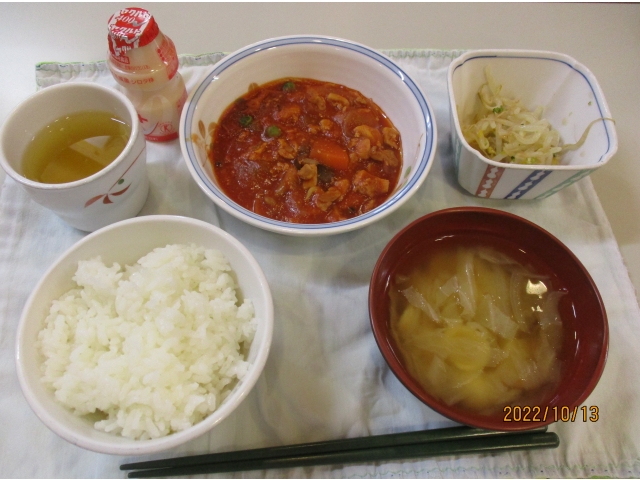 ・チキンのトマト煮込み・シュリンプサラダ・キャベツとマカロニスープ・ごはん・ヤクルト エネルギー459kcal、たんぱく質30.7g、脂質4.6g、炭水化物76.8g、食塩1.9g