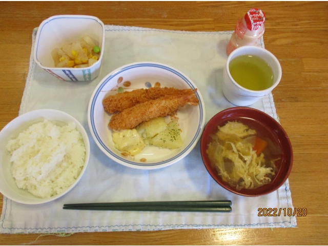 ・エビフライ・キャベツと卵のコンソメスープ・大根と枝豆のサラダ・ごはん・ヤクルト エネルギー643kcal、たんぱく質29g、脂質17.1g、炭水化物81.9g、食塩2.9g