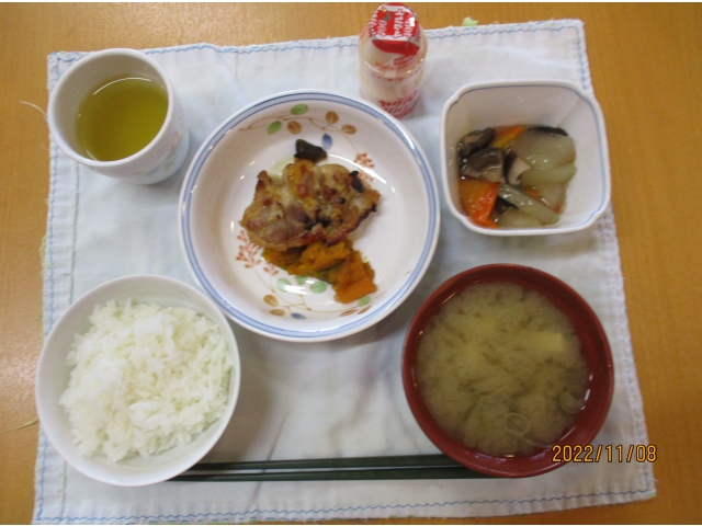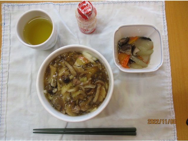 Aメニュー ・鶏肉のもろみ焼・冬瓜のくず煮・ごぼう汁・ごはん・ヤクルト エネルギー509kcal、たんぱく質24.5g、脂質6.1g、炭水化物92.8g、食塩1.9g Bメニュー ・きのこあんかけうどん・とうがんくず煮・ヤクルト エネルギー373kcal、たんぱく質14.5g、脂質2.5g、炭水化物78.7g、食塩2g"