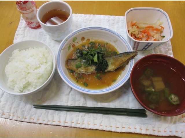 ・さんまのおろし煮・ツナ大根サラダ・おくら汁・ごはん・ヤクルト エネルギー515kcal、たんぱく質20.5g、脂質18g、炭水化物68.7g、食塩2.2g