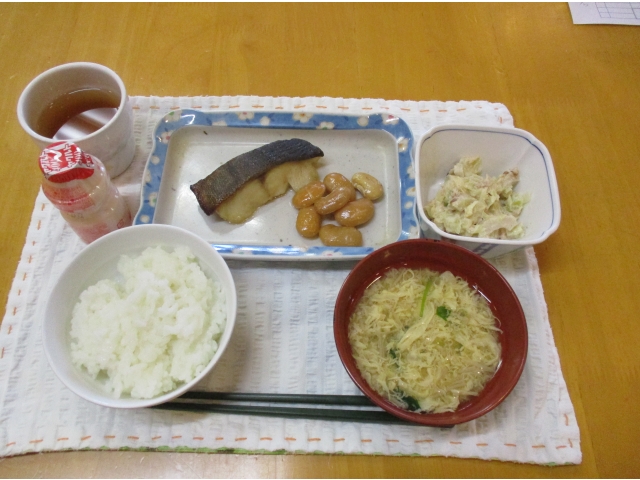・ムツの西京焼・かき玉汁・キャベツとツナの和風マヨ・ごはん・ヤクルト エネルギー543kcal、たんぱく質23.5g、脂質19.3g、炭水化物69.7g、食塩2.4g