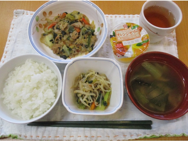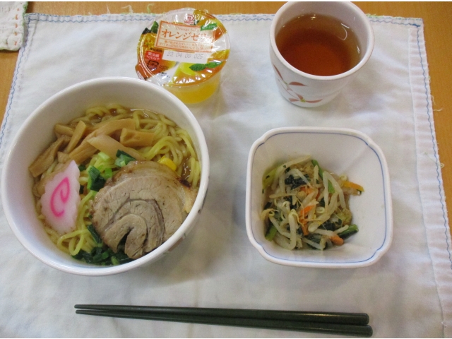 Aメニュー ・豚の塩たれ焼・ナムル・青菜スープ・ごはん・オレンジゼリー【A】エネルギー557kcal、たんぱく質23.3g、脂質20.9g、炭水化物70.2g、食塩2.8g Bメニュー ・味噌ラーメン・ナムル・オレンジゼリー【B】エネルギー467kcal、たんぱく質17g、脂質9.1g、炭水化物77g、食塩2.5g
