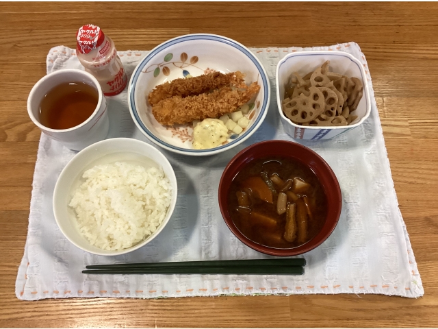 ・エビフライ・具だくさん汁・れんこんきんぴら・ごはん・ヤクルト エネルギー622kcal、たんぱく質16.2g、脂質25g、炭水化物86.1g、食塩2.5g