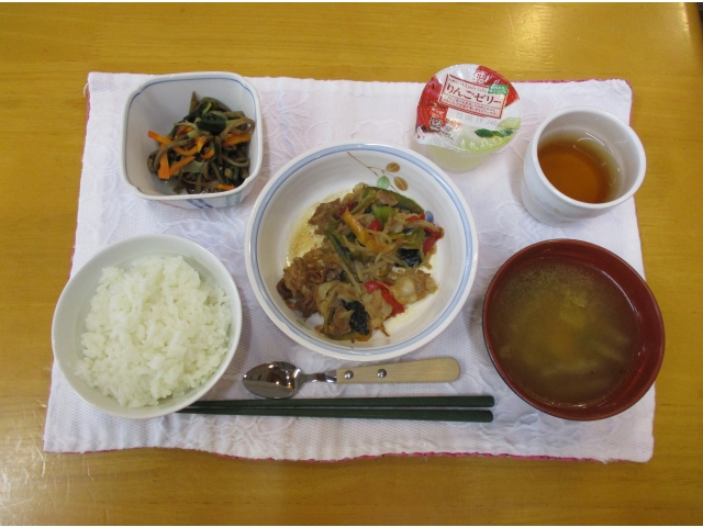 ・豚肉のオイスター炒め・白菜と帆立のスープ・ナムル・ごはん・りんごゼリーエネルギー543kcal、たんぱく質21.4g、脂質23.9g、炭水化物64.2g、食塩1.3g