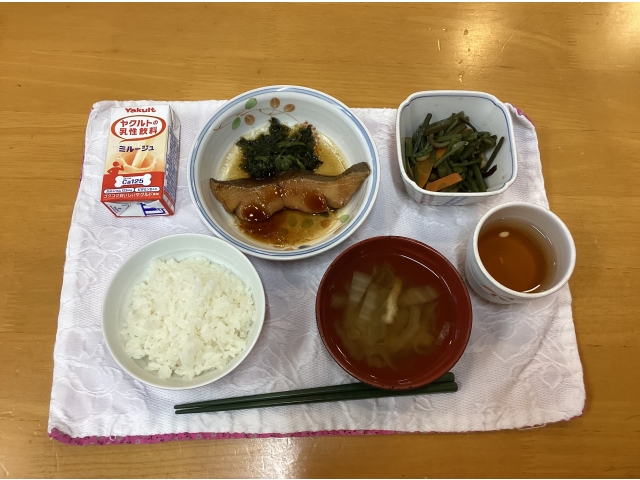 ・かれいの照り煮・山菜煮・具だくさん汁・ごはん・ミルージュエネルギー431kcal、たんぱく質20.7g、脂質4.8g、炭水化物66.6g、食塩3.6g