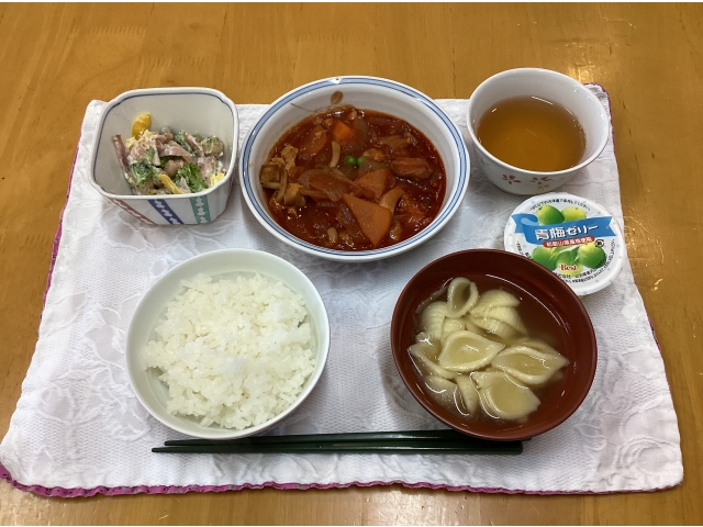 ・チキンのトマト煮込み・シュリンプサラダ・キャベツとマカロニスープ・ごはん・青梅ゼリーエネルギー578kcal、たんぱく質33.5g、脂質16.3g、炭水化物79.1g、食塩1.7g
