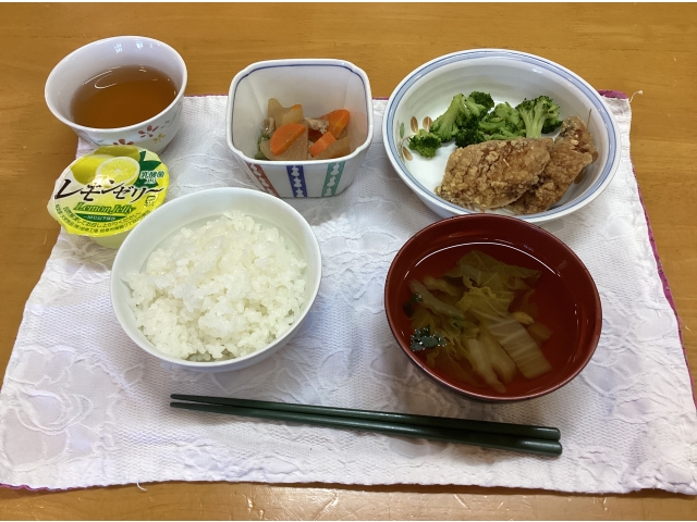 ・鯵の竜田揚げ・いりどり・すまし汁・ごはん・レモンゼリーエネルギー561kcal、たんぱく質26.8g、脂質14.2g、炭水化物81.2g、食塩2.4g