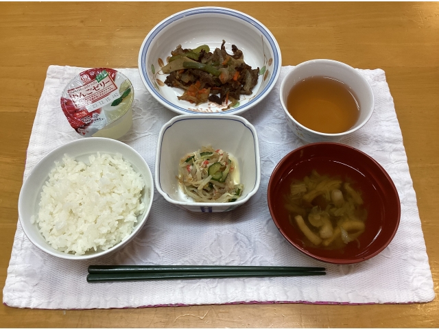 ・牛肉とピーマンの細切り炒め・中華サラダ・きのこ汁・りんごゼリーエネルギー597kcal、たんぱく質18.5g、脂質30.2g、炭水化物64.8g、食塩1.9g