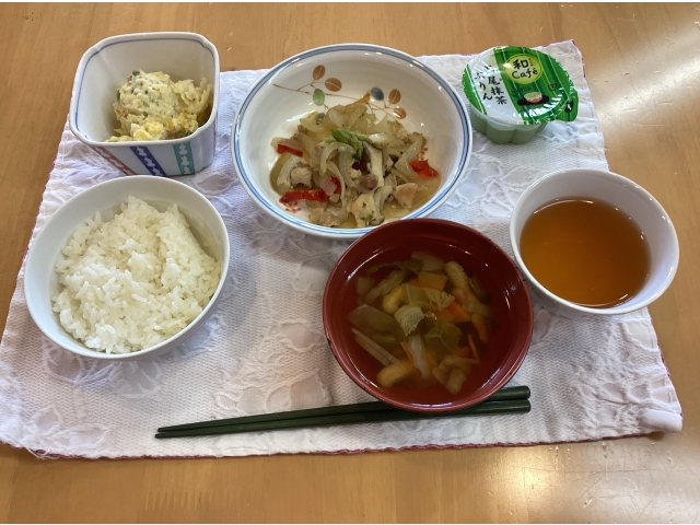・鶏ときのこのガーリック炒め・粒マヨサラダ・野菜汁・ごはん・抹茶プリンエネルギー624kcal、たんぱく質25.7g、脂質29.6g、炭水化物66.9g、食塩2.9g
