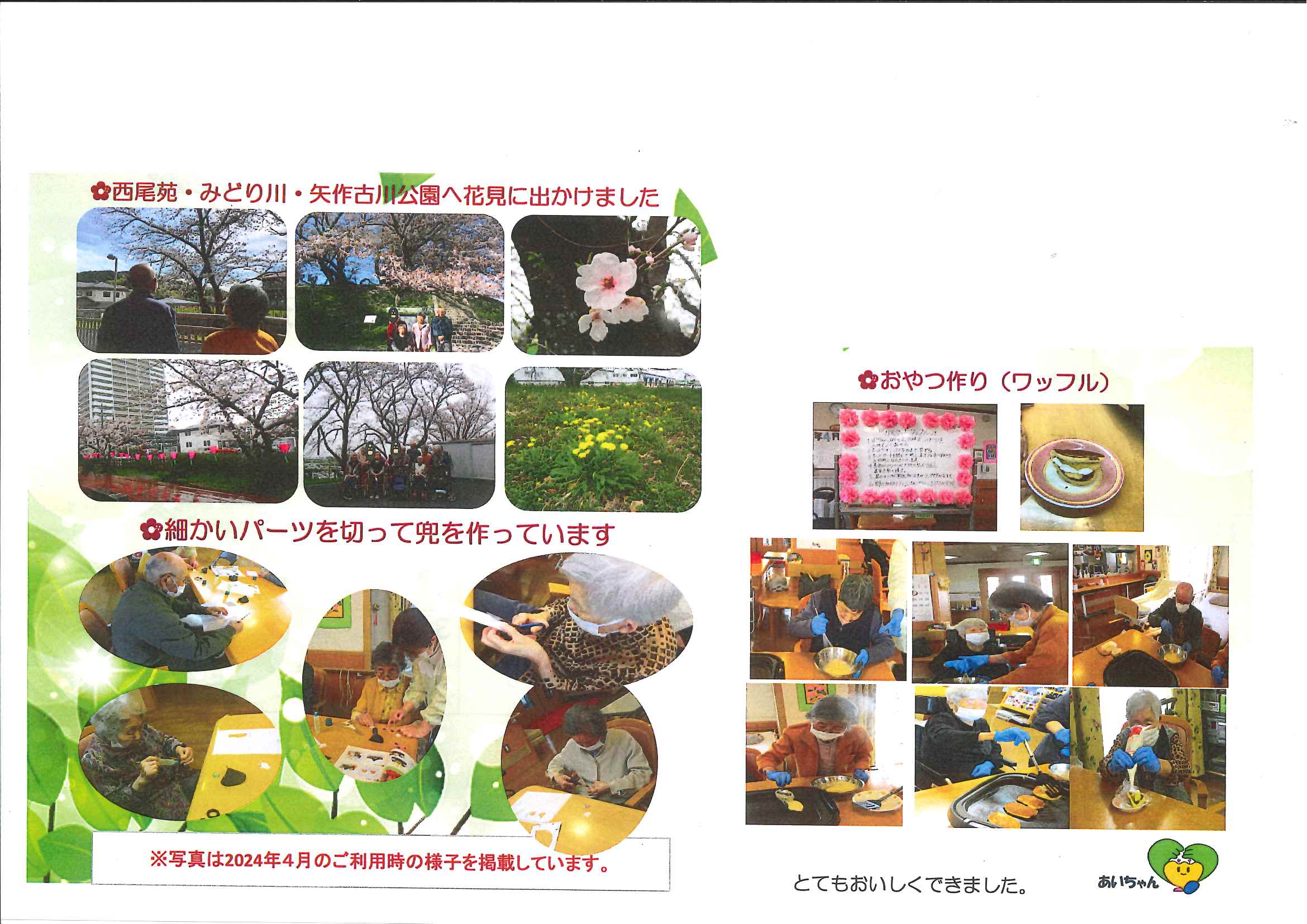 デイサービスがある西尾苑では、ソメイヨシノがたくさんあります。苑内を散歩しながら、桜を鑑賞しました。また、みどり川や矢作古川公園、黄金堤、八ツ面山などご利用者様よりリクエストのあった場所へ外出しました。きれいな桜を見るために、車の昇降や移動を皆様がんばられました。思ったよりも歩けたり、お話が弾んだそうです。
