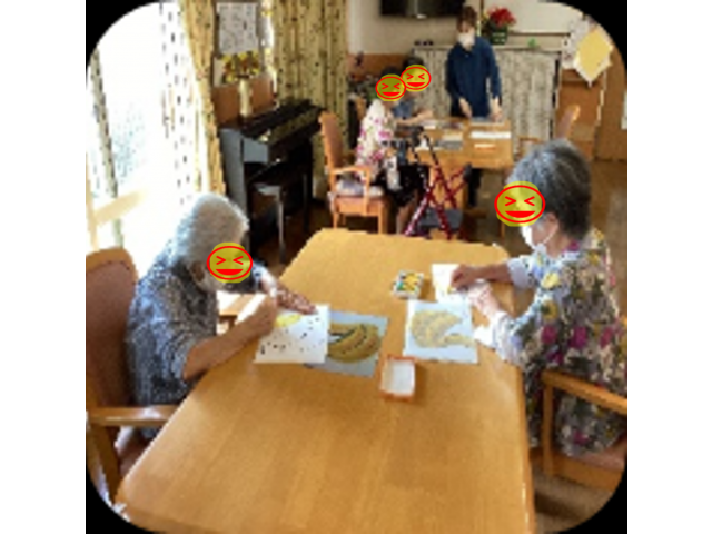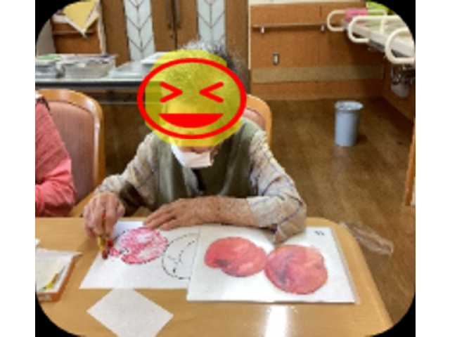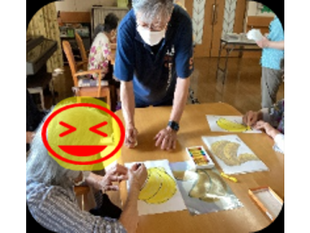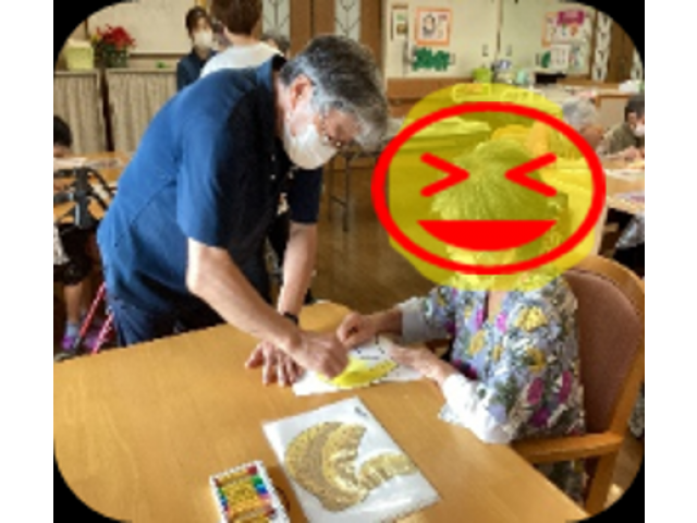今月は9月19日に絵画ボランティアの天野様がきて下さり、クレヨンを使い絵を書きました。クレヨンの新しい使い方に皆さんびっくりしていました。下絵を決めて見本を見てクレヨンで塗っていきます。指を使いクレヨンを伸ばすと、とても味のある絵になります。