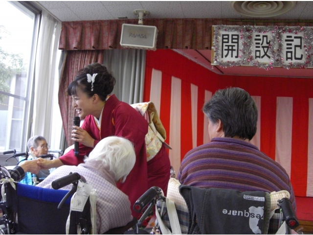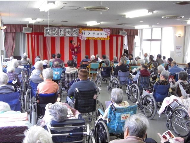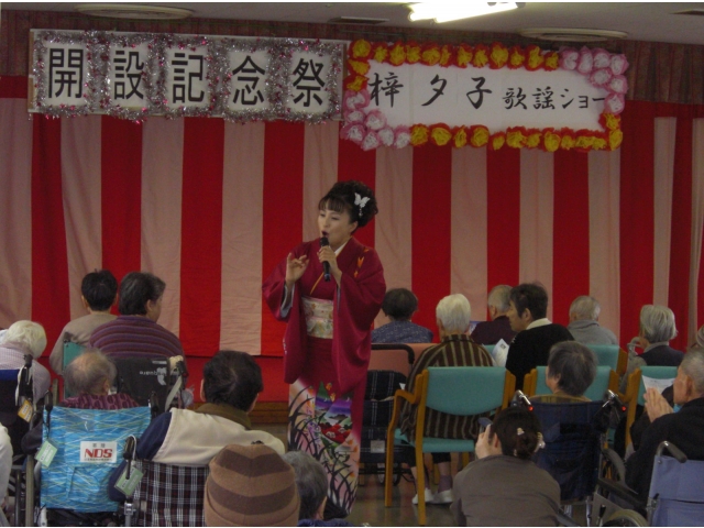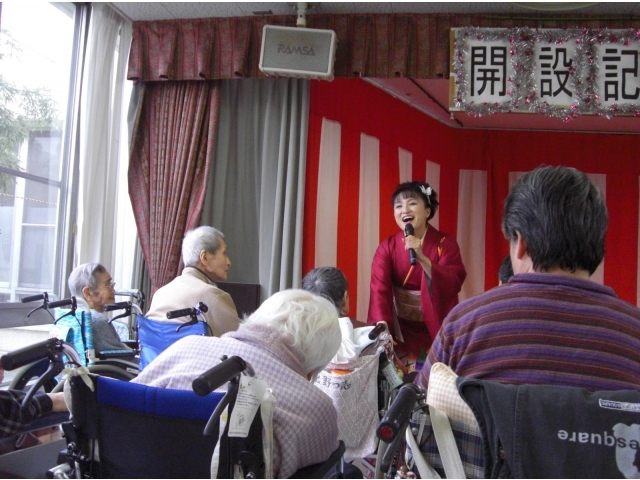 平成24年12月5日(水)に開設記念祭を開催しました。 歌手の梓夕子さんをゲストに迎え、昔懐かしい歌から本人のオリジナルの曲まで約1時間の歌謡ショーとなりました。 利用者も大変喜び、楽しい時間を過ごせたと思います。