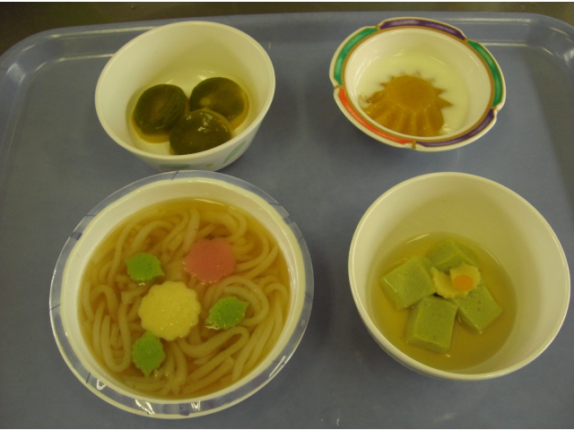 うどんは試行錯誤の結果作り上げられた絶妙な硬さのソフト食を、ところ天つきで仕上げました。南瓜サラダは2層することで南瓜らしくなるように工夫しています。