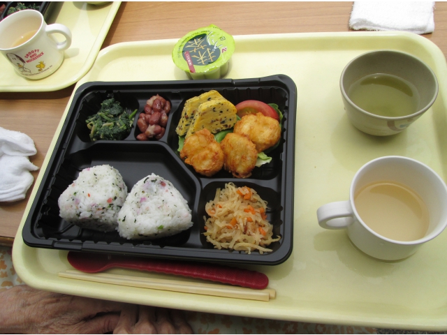 お弁当箱の中身は厚焼き玉子にチキンナゲット、青菜和え、そして大きなおにぎり!5月に誕生日を迎える方を紹介しながら、ジュースやビールで乾杯!
