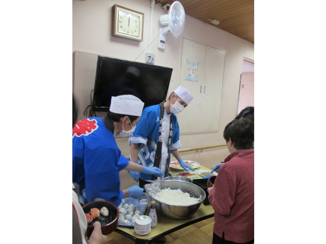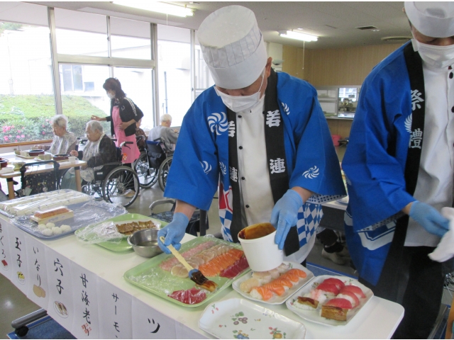 寿司バイキングが始まるとあちこちから「うまい」「おかわり」との声が飛び交い、何回も並ぶ利用者様に話を伺うと「目の前で調理師が握ってくれる寿司は最高~!!」との事でした。