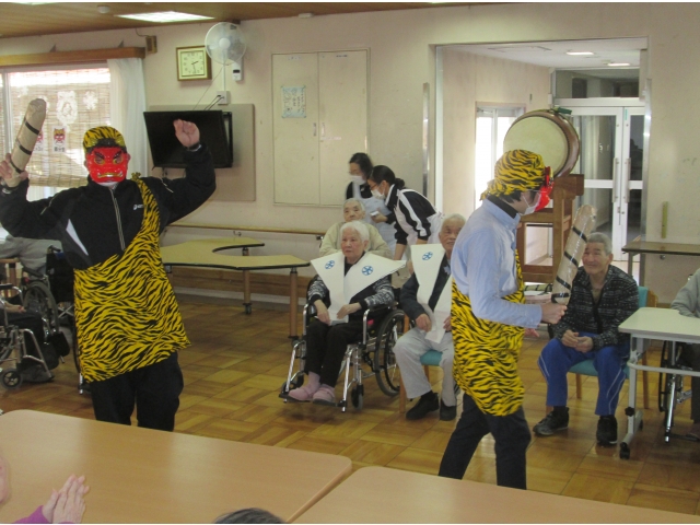 まずはじめ苑長から年男・年女を紹介して頂き、太鼓に合わせ「鬼は外」「福は内」と元気よく掛け声をかけました。