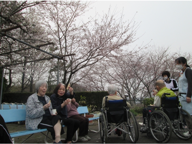 3月30日、大府苑の庭先で花見をしました。 この日は曇り空でしたが、風もなく穏やかな花見日和でした。 利用者様は「きれいだね」「満開だね」と花見を楽しんでおられました。 「満開」になる見ごろは、週末?!と時期が早い「五分咲き」の花見をしながら午後の楽しいひと時を過ごしました。