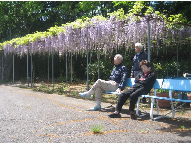 4月22日大府苑、苑内散歩訓練中、藤棚ベンチでしばし休憩。この日は、朝から詩吟教室があったので、いつもの散歩メンバーより少し少なめなメンバーでした。