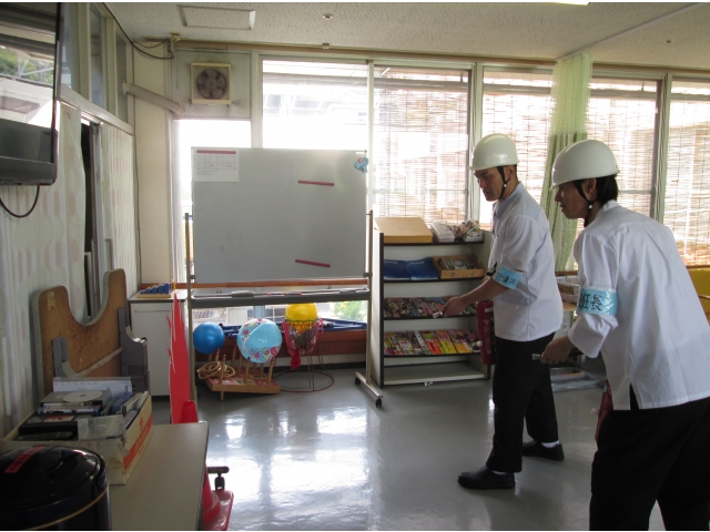 震度7の地震が発生、厨房付近で火災が発生したという想定で消火訓練、避難訓練も実施しました。