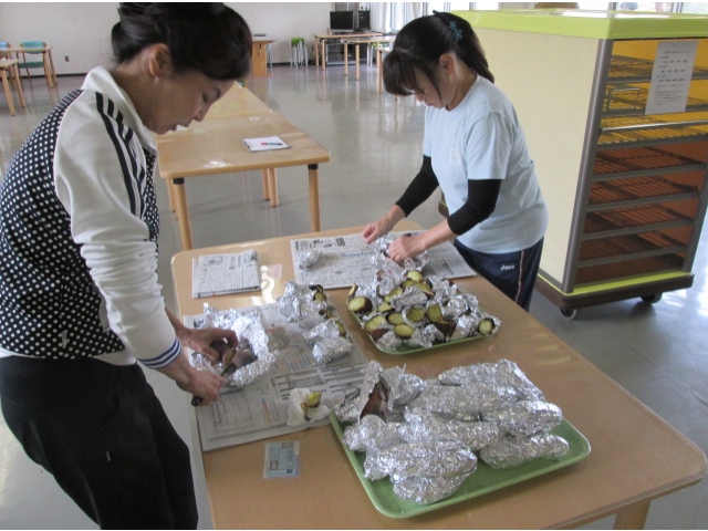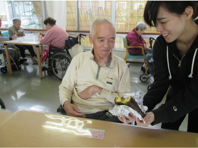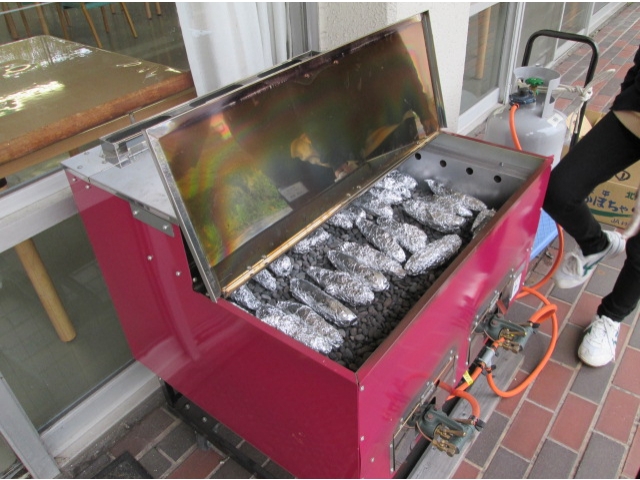 10月25日(水)、おやつに石焼きいもを焼きました。管理栄養士臨地実習の学生さんにも手伝っていただき、たくさんのさつまいもを焼き上げました。