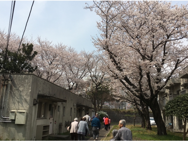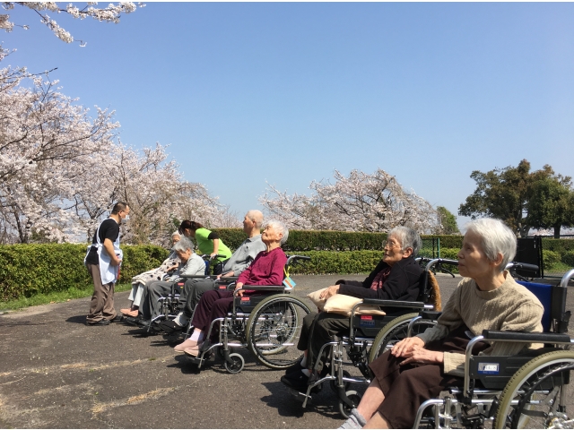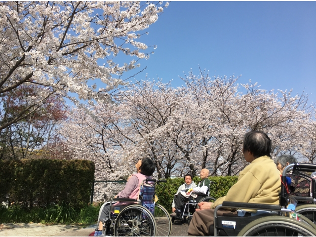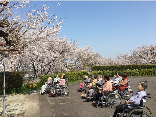 ご利用者の散歩も兼ねて、花見を行いました。風もなく、汗ばむくらいの陽気で、みなさんで満開の桜を眺めて「きれいね~」「久しぶりのお花見だわ」などと話されていました。