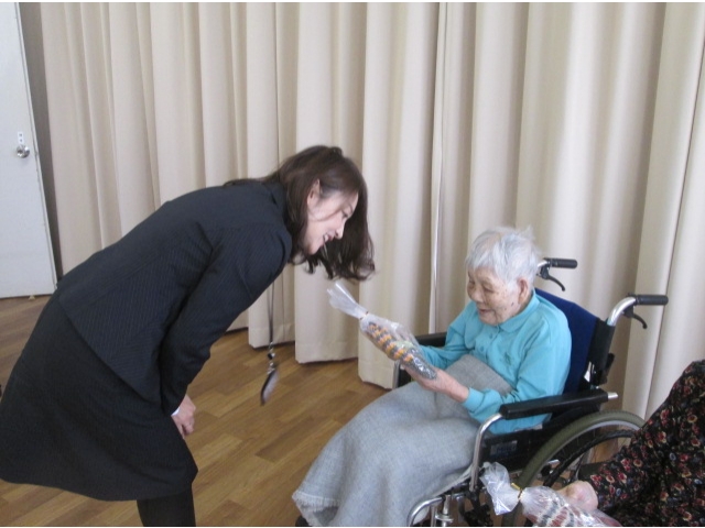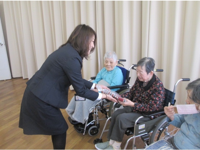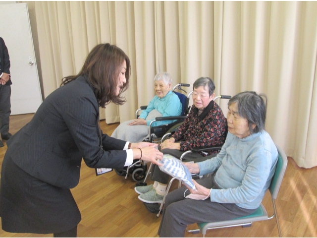 当日は、3名のご利用者様に代表で受け取っていただき、早速試着していただきました。みなさんお似合いで、「暖かいね」と笑顔がこぼれました。心のこもったプレゼントに私たち職員の心も暖かくなった一日となりました。