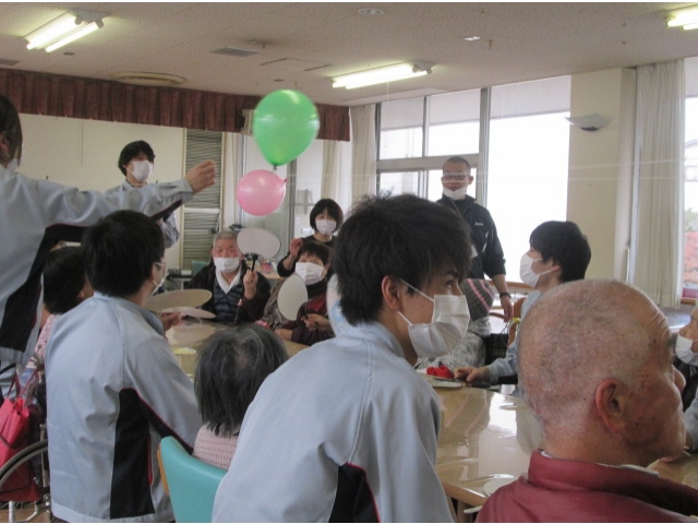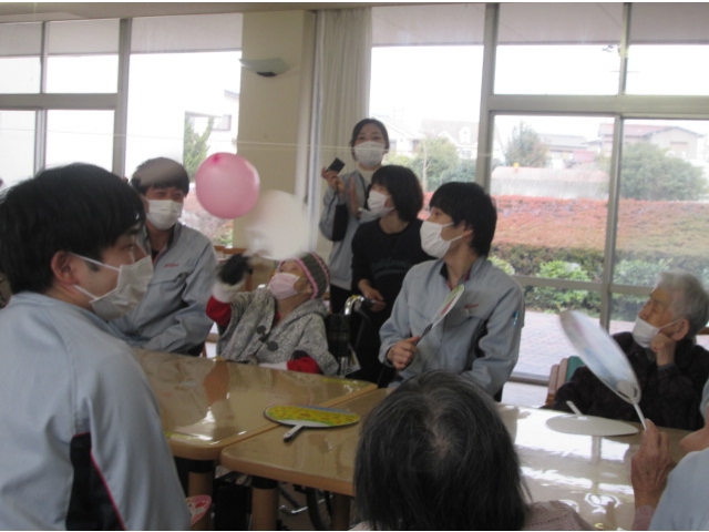ご利用者様、新入社員の方たちで2チームに分かれ風船送りゲームを楽しみ、大きな歓声が上がっていました。