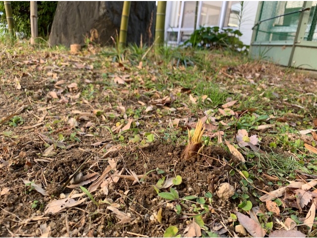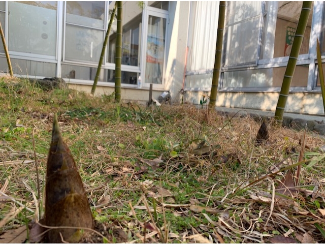 大府苑には食堂の横に陽当たりのよい中庭があります。そこに土の中からひょっこりと顔を出した竹の子たち。