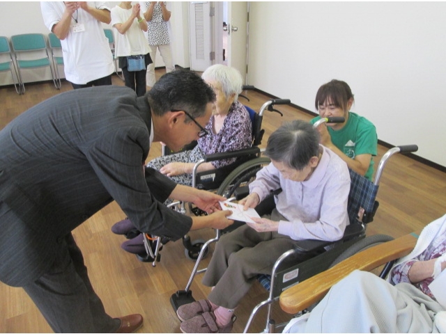 9/6(金)、大府市高齢障がい支援課長様が来苑され、敬老金の贈呈が行われました。