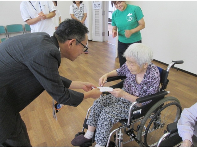 100歳以上の方、数え100歳の方にお祝い金を手渡され、その後、記念写真を撮らさせていただきました。