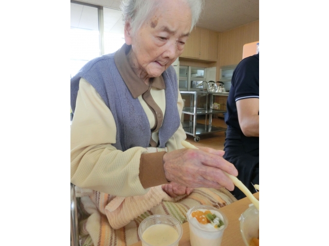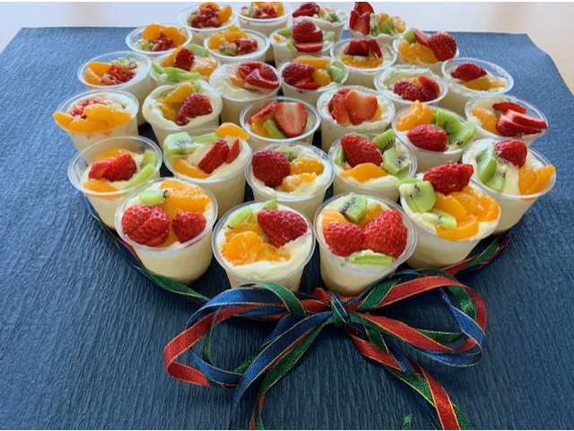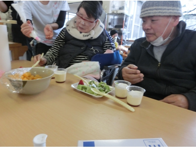 今日はクリスマス会!今年はみんなでプリンを作ります。生クリームをくるくるっと絞ってフルーツを山盛りに飾り、手についたクリームはペロっと…