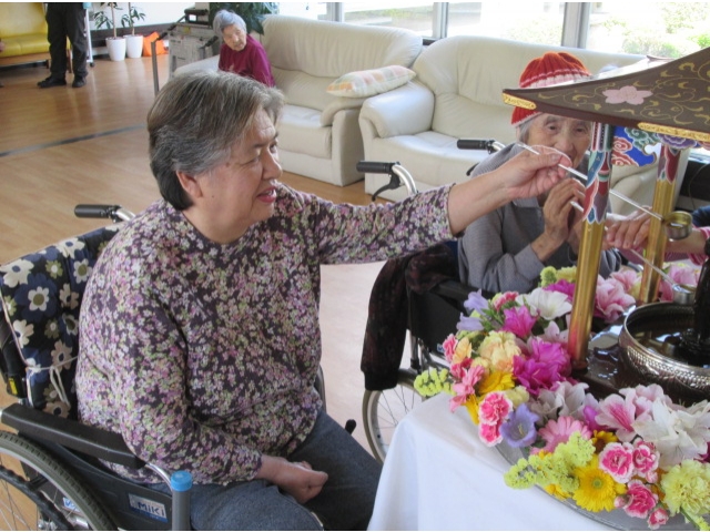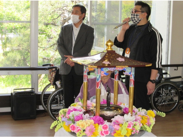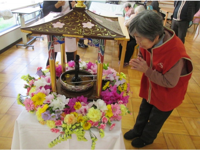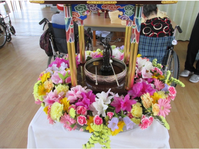 花祭りとは、お釈迦さまに甘茶をかけて誕生日をお祝いするお祭りです。飾り付けのお花には苑内に咲いているお花も併せて飾りました。