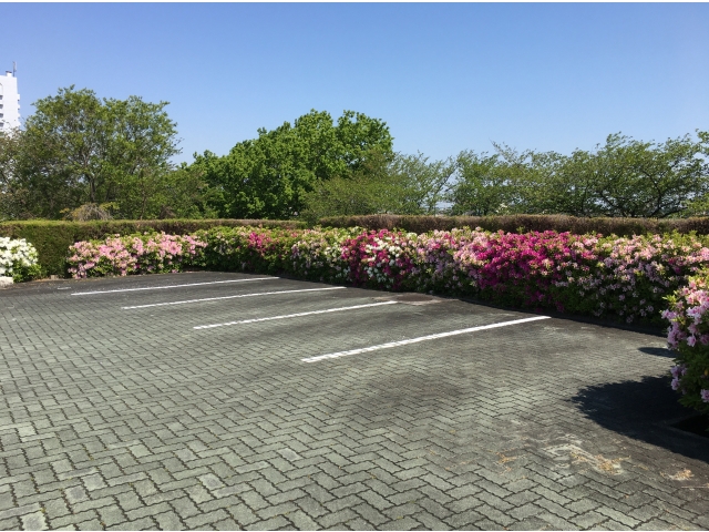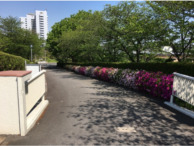 「花の苑」にふさわしく、今はつつじが見ごろで、門の周りから駐車場まで、華やかに彩られています。道路から門に続く坂道は、さながら「花の路(みち)」。私たちの目を楽しませてくれています。