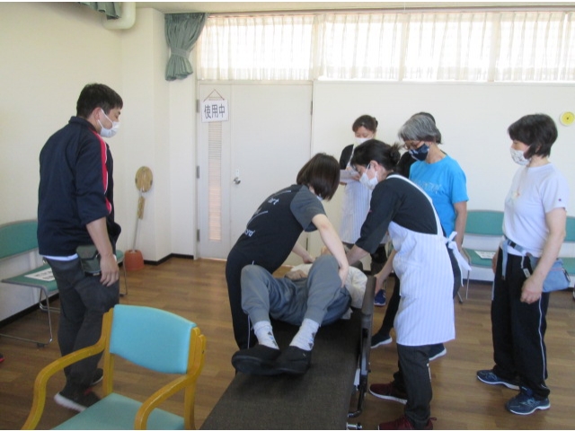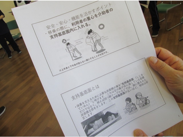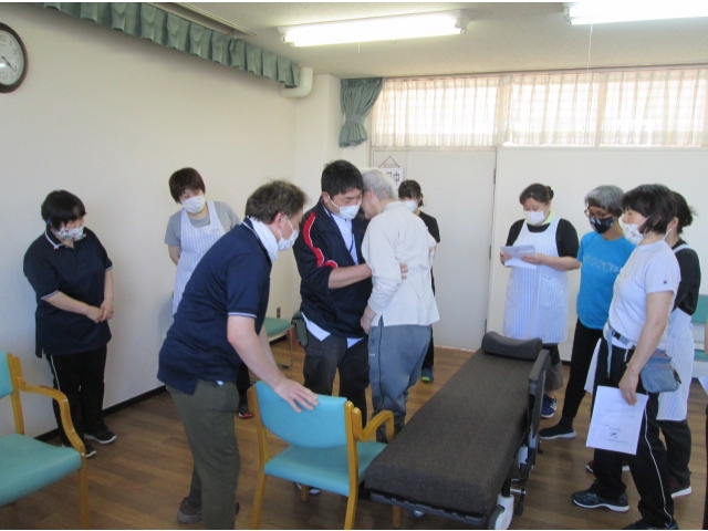 実際に利用者の方にモデルになっていただき、機能訓練指導員を講師として移乗介助の仕方を学びました。