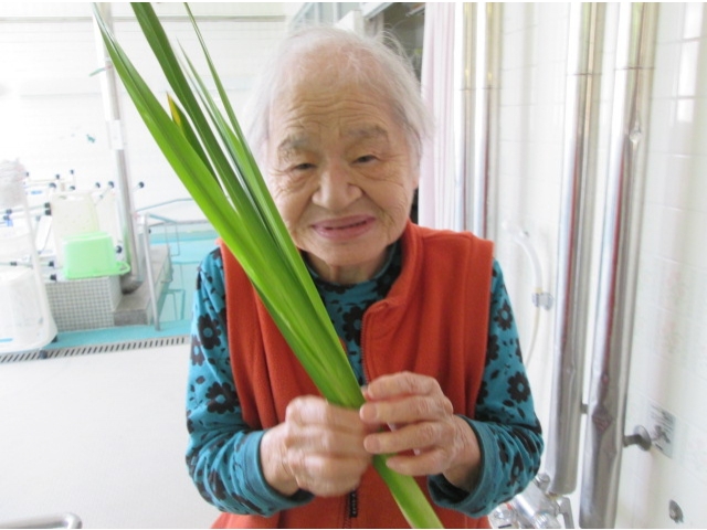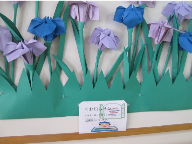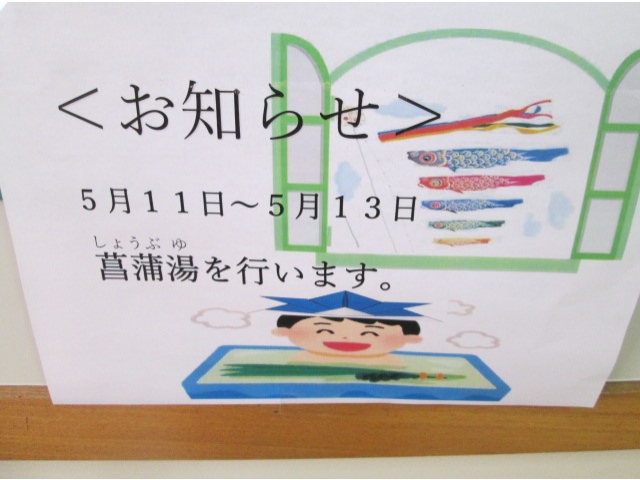 5月12~14日の3日間しょうぶ湯を楽しみました。菖蒲湯(しょうぶゆ)の由来は、古代中国で、古くから薬草として菖蒲を利用して、漢方の湯治療のひとつでした。また菖蒲は邪気を祓うといわれています。利用者の皆様も体を温め、中にはハチマキのように頭に巻いて楽しまれていました。