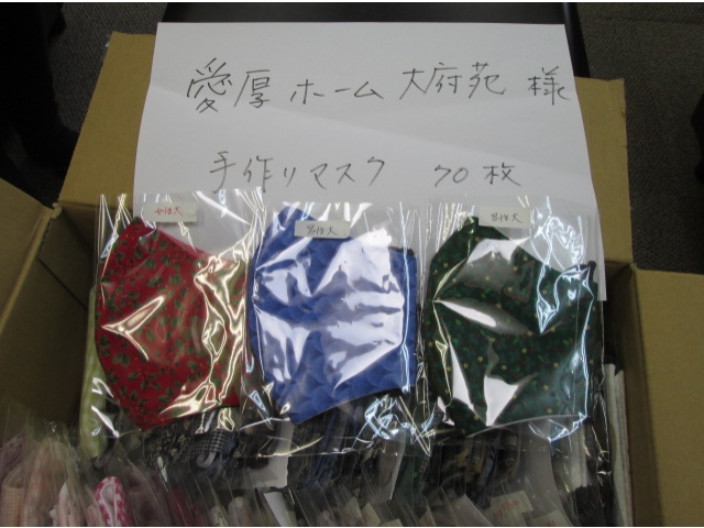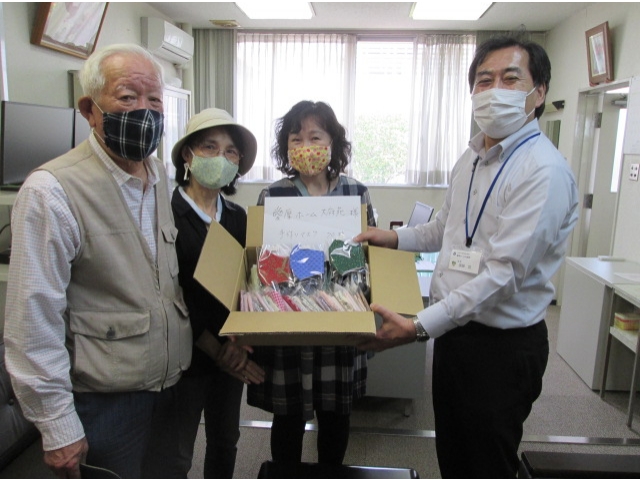 5月22日金曜日に、「大府コミュニティ文化福祉部会」の皆様から手作りマスクの寄贈がありました。会員の皆様の自宅にある布地を提供していただき、真心をこめて作成していただいたとのことでした。