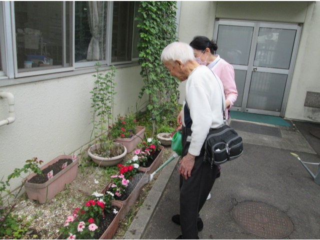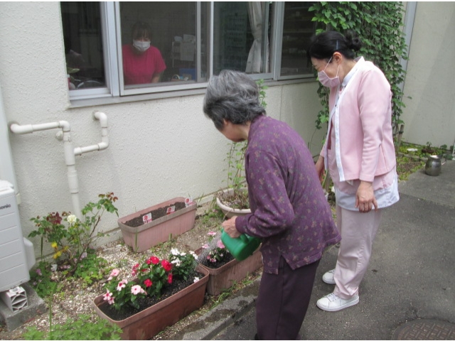 6月になり、暑くなってきました。日日草を植えたり、ヒマワリやコスモスの芽、アサガオにお水をあげながら、素敵な花がたくさん咲きますようにと利用者様と職員が協力して育てています。