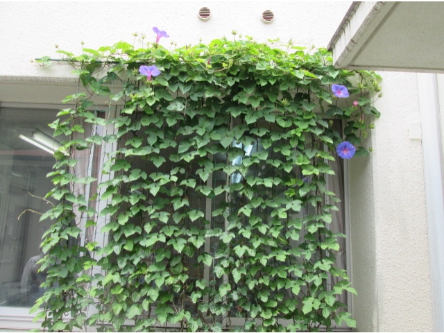 医務室の横に、アサガオのグリーンカーテンと様々なお花が植えてある花壇があります。