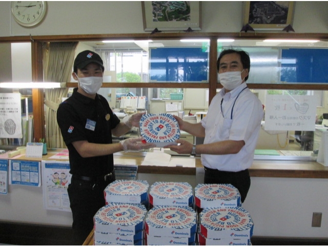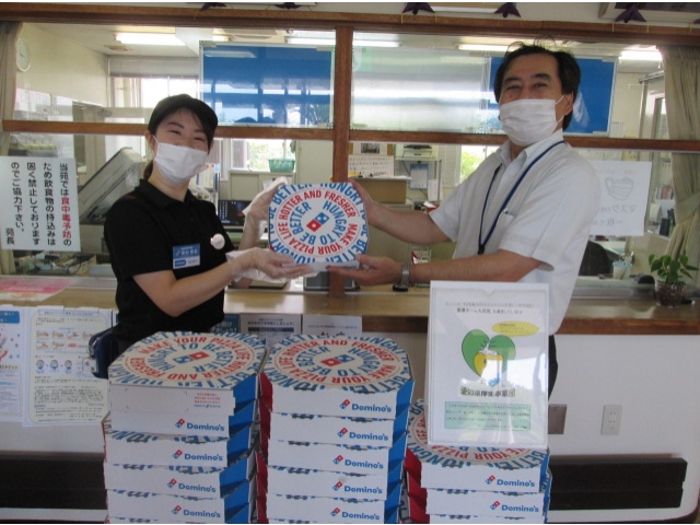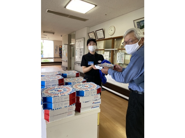 - ドミノ・ピザのスタッフの方から苑長へピザの贈呈です。6月9日から11日の3日間で72枚ものピザをいただきました。